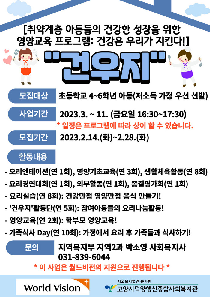 [부자동네타임즈 김인수기자] 고양시덕양행신종합사회복지관(관장 김진우)에서는 월드비전의 지원을 받아 취약계층 아동의 식생활개선을 통한 건강한 성장 도모를 위해 ‘건우지’ 프로그램을 진행한다.