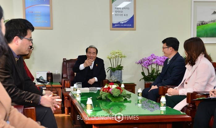 | △장휘국 광주시교육감은 교육감실에서 지난 1월 1일 자로 본청에 전입한 6급이하 직원들과 간담회를 갖고 오찬을 함께 했다 |
