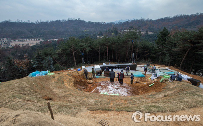 (서울=포커스뉴스) 27일 오전 서울 국립현충원 故 김영삼 전 대통령 묘역에서 인부들이 26일 안장된 김 전 대통령 묘지의 봉분을 만드는 작업을 하고 있다. 전날 안장식 후 봉분 등 대부분의 묘지 조성 작업은 마무리 됐지만 묘소 주변 조경의 마무리로 묘역이 완성된 모습을 갖추려면 한 달여가 더 걸릴 전망이다.