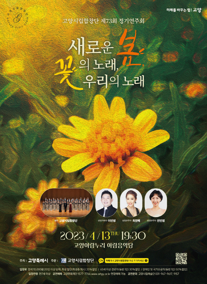 [부자동네타임즈 김인수기자] 꽃향기가 가득한 4월, 고양특례시의 대표 문화사절단 고양시립합창단이 2023년 국제꽃박람회의 성공적인 개최를 기원하며 오는 13일(목) 아람음악당에서 제73회 정기연주회 『새로운 봄, 꽃의 노래, 우리의 노래』를 선보인다.