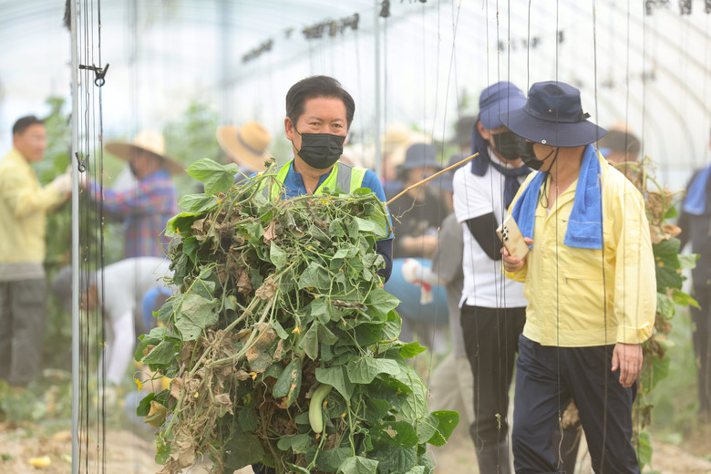 정청래 신임 더불어민주당 대표가 3일 오전 전남 나주시 노안면 오이농가를 찾아 수해 복구 작업을 하고 있다. 2025.8.3