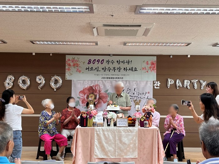 [부자동네타임즈 김인수기자] 고양시향동종합사회복지관(관장 양복선)가 7월 31일 독거어르신 중 팔순·구순을 맞이한 어르신을 초청해 생신 축하 행사 ‘8090 장수 한마당!’을 열었다. 이날 행사에 팔순 어르신 4명, 구순 어르신 2명과 지역 주민, 복지관 관계자가 참여했다.