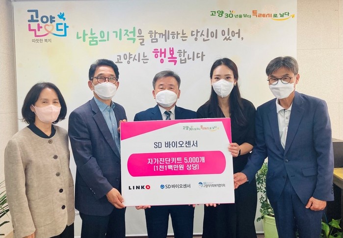 전달식에는 ㈜링코제일 박문철 상무이사, SD바이오센서 이미소 팀장, 사회복지협의회 이창원 회장, 시 관계자들이 함께했다.