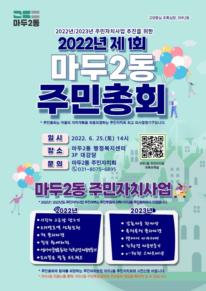 [부자동네타임즈 김인수기자] 고양시 일산동구 마두2동 주민자치회(회장 김명희)가 오는 6월 25일(토) 첫 번째 주민총회를 개최한다. 주민총회는 마을주민 만 18세 이상 누구나 참여할 수 있는 주민자치회의 최고 의사결정 기구로서 마을사업을 주민과 공유하고 논의하는 공론의 장이자 주민투표를 통해 마을사업 시행 여부를 결정하는 자리이다.