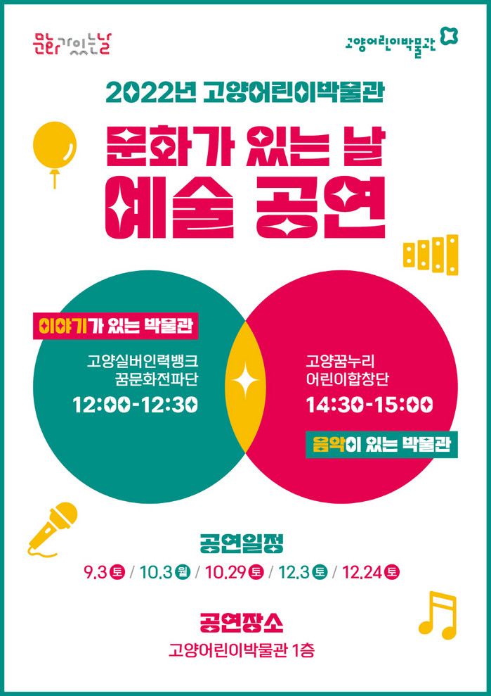 어린이박물관 관계자는 “문화가 있는 날 사업을 확대하고 관람객과 지역민에게 문화향유의 기회를 제공할 것”이라며 “문화가 있는 날 공연을 시작으로 고양어린이박물관이 다양한 문화공연과 함께 가족들의 문화쉼터로 거듭날 수 있도록 최선을 다 하겠다”고 전했다.