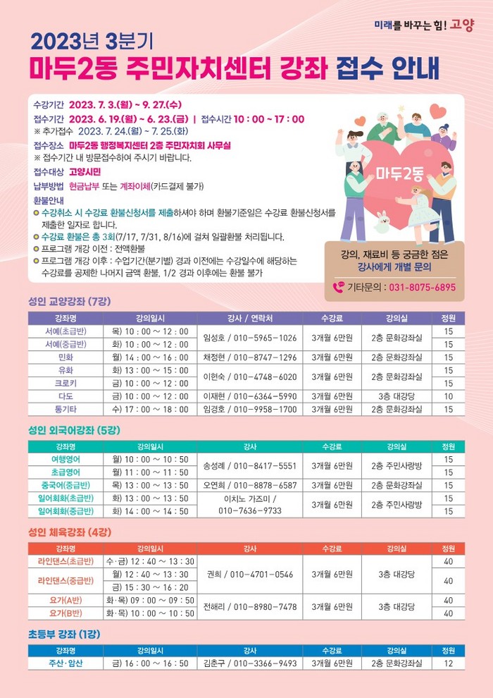 [부자동네타임즈 김인수기자] 고양특례시 마두2동 주민자치회는 2023년 3분기 주민자치센터 문화강좌 프로그램 수강생을 모집한다고 19일 밝혔다.