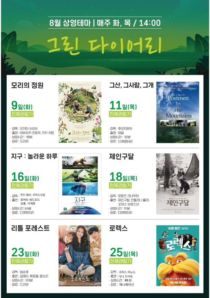 8월 9일부터 매주 화, 목, 오후 2시에는 ‘그린 다이어리’를 테마로 ▲모리의 정원 ▲그 산, 그 사람, 그 개 ▲지구 ▲제인구달 ▲리틀 포레스트 ▲로렉스를 상영한다. 자연과 동물들을 소재로 한 영화를 보면서 힐링 받는 시간이 될 예정이다.