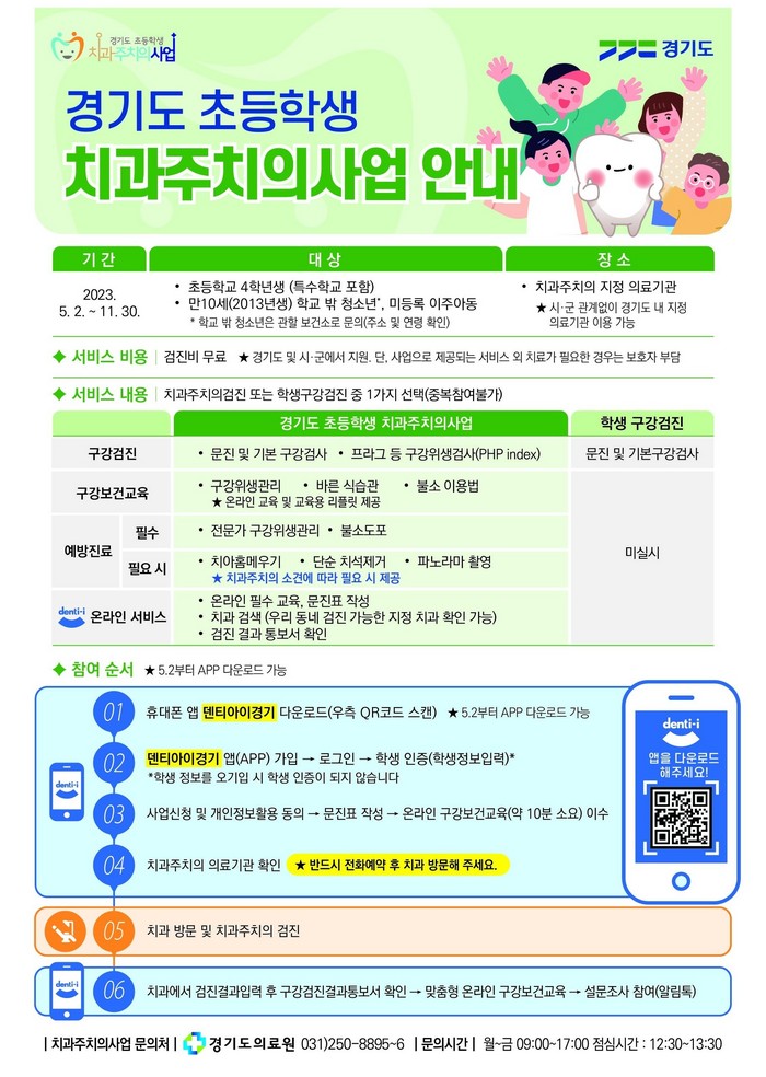 참여 방법은 ‘덴티아이경기’ 앱에 가입하여 사전 문진표 작성과 온라인 구강보건교육을 마친 뒤 희망하는 치과주치의 지정 의료기관에 전화 예약 후 방문하면 된다. 치과주치의 지정 의료기관은 고양시 보건소 홈페이지 및 ‘덴티아이경기’ 앱에서 확인할 수 있다.