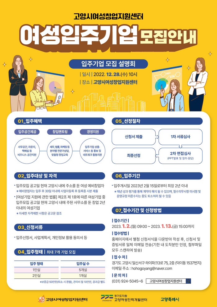 자세한 문의는 고양시 여성창업지원센터(☎031-924-5045~6)로 하면 된다.
