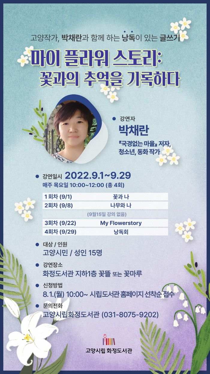 [부자동네타임즈 김인수기자] 고양특례시(시장 이동환) 꽃 특성화 도서관 화정도서관이 낭독회가 포함된 ‘마이 플라워 스토리: 꽃과의 추억을 기록하다’ 강좌를 운영한다.