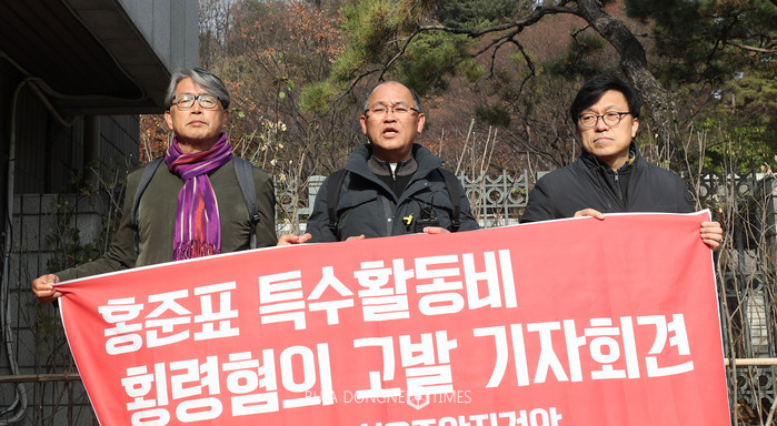 [부자동네타임즈 이세제 기자]24일 오전 서울 서초구 서울중앙지검 앞에서 세금도둑잡아라 관계자들이 홍준표 특수활동비 횡렴혐의 고발 기자회견을 열고 있다. 2017.11.24.