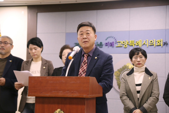 [사진설명] 고양특례시의회 의장단 및 상임위원장단 대표로 김영식 의장 성명서 발표하고 있다.