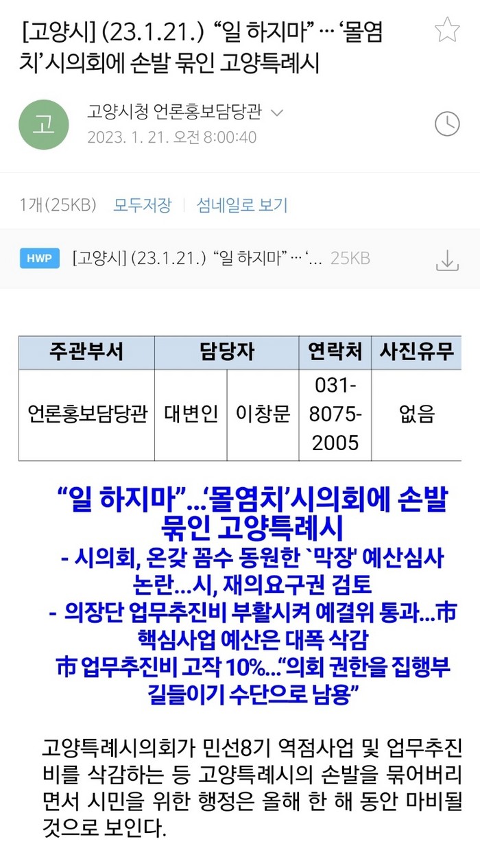[사진설명] 고양특례시에서 보낸 보도자료 이창문 대변인의 문건.