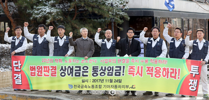 [부자동네타임즈 이세제 기자]24일 오전 서울 서초구 서울중앙지방법원앞에서 열린 '법원판결 상여금은 통상임금, 즉시 적용하라' 기자회견에 참석한 기아차노조원들이 구호를 외치고 있다. 2017.11.24.