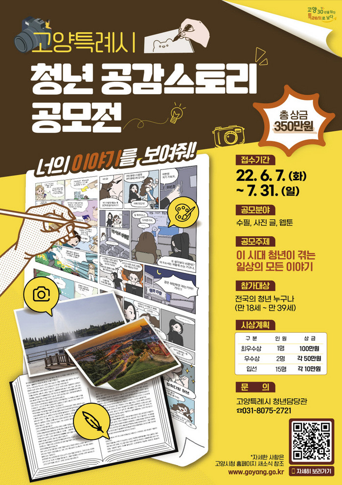 [부자동네타임즈 김인수기자] 고양특례시(시장 이동환)에서 지난달부터 시작한 고양시 청년 공감스토리 공모전의 신청⋅접수가 7월 31일에 마감될 예정이다.