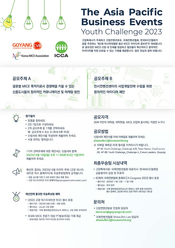 [부자동네타임즈 김인수기자] 고양컨벤션뷰로(이사장 이동환)는 ‘2023 아시아태평양 청년 MICE 아이디어 공모전 (공식명칭: Asia Pacific Business Events Youth Challenge 2023)’을 개최한다고 27일 밝혔다.