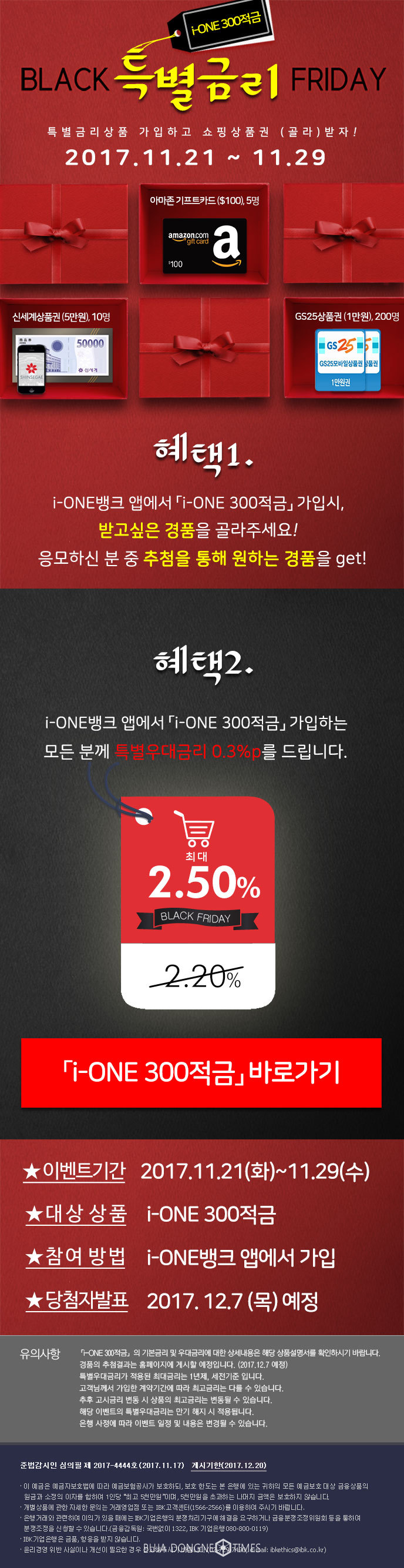 [부자동네타임즈 이현재 기자]IBK기업은행은 블랙프라이데이 시즌을 맞아 오는 21일부터 29일까지 특별금리와 쇼핑상품권을 제공하는 이벤트를 진행한다고 밝혔다.