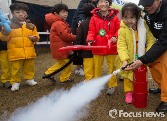 (대전=포커스뉴스) 19일 오전 대전 서구 둔산로 대전시청 남문광장에서 열린 안전문화 체험 한마당에 참가한 어린이들이 소화기 체험을 하고 있다.
