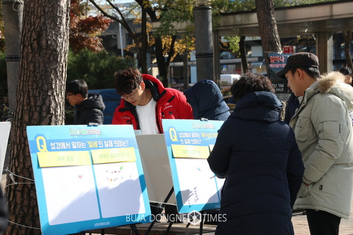 이날 안산시온교회는 시민과 직접 만나 기성교단의 음해로 오해를 받고 있는 부분을 바르게 알리고 기성교단과의 교리를 비교하는 자료로 ‘성경에서 말하는 말세의 실제 의미는?’ 외 5개의 자료를 통해 시민이 직접 선악을 가릴 수 있는 자리를 마련했다.