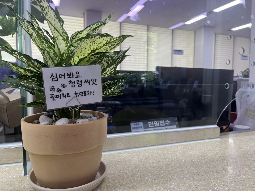 민원창구에 놓인 청렴 화분에는 직원들이 직접 손으로 작성한 청렴문구가 꽂혀 있어, 시민들과 함께 청렴에 대해 한 번 더 생각해 볼 수 있다.
