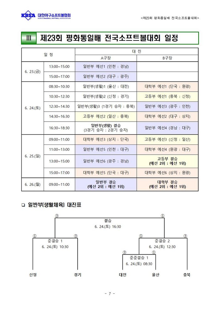 소프트볼대회에는 고등부 3개팀, 대학부 4개팀, 일반부 4개팀, 생활체육부 5개팀이 참가하여 4일간의 열전을 벌인다. 일반부와 대학부, 고등부는 각각 풀리그를 거쳐 상위 2개팀간 결승을 통해 우승팀을 가리며, 생활체육부는 토너먼트를 통해 우승을 결정한다. 일반부에서는 올해 전국대회 타이틀을 모두 가져가고 있는 인천에 맞서, 평화통일배 우승 트로피를 가져갈 팀이 나타날지가 최대 관심사이다.