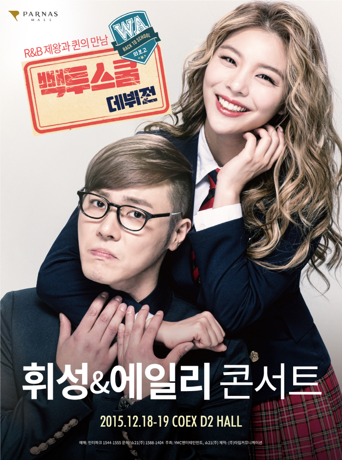YMC엔터테인먼트는 23일 “휘성과 에일리가 오는 12월 18~19일 이틀 동안 서울 삼성동 소재의 코엑스 D2홀에서 합동콘서트 ‘빽투스쿨(Back to School)’을 열고 팬들과 만난다”고 밝혔다.
