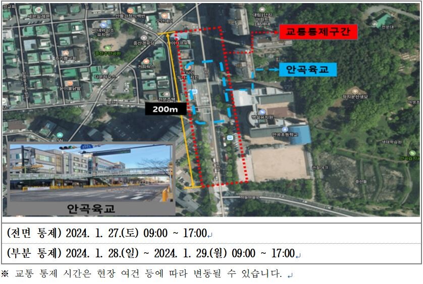 시 관계자는 “안곡육교 철거 공사에 대하여 티비에스(TBS) 교통방송 안내 등의 홍보를 진행할 예정”이라며, “당일 현장 주변 주민들과 중산로를 이용할 계획이 있는 시민들은 통제 구간 및 시간을 확인해 줄 것”을 당부했다.