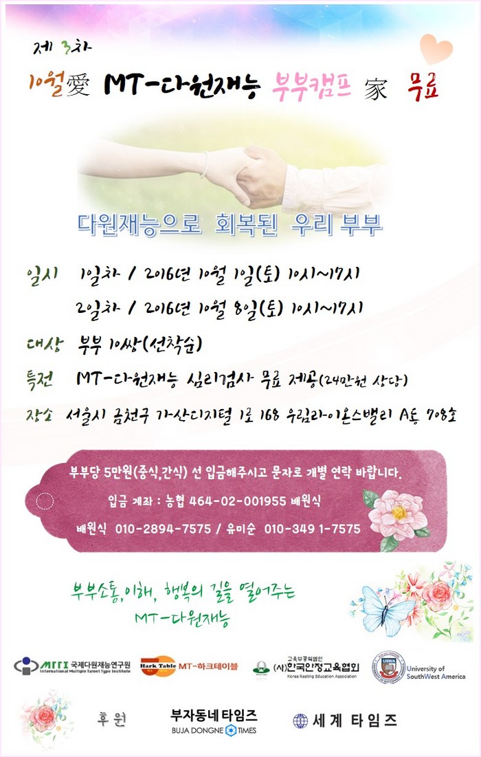 [부자동네타임즈 임홍빈 기자]국제다원재능연구원에서는 MT-다원재능 부부캠프 참여자를 모집하고 있다.