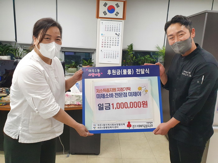 [부자동네타임즈 김인수기자] 고양시 마두1동에 소재하는 마제야(대표 장동호)에서 지난 9일 마두1동행정복지센터에 저소득가정을 위해 써달라며 후원금 100만원을 기부했다.