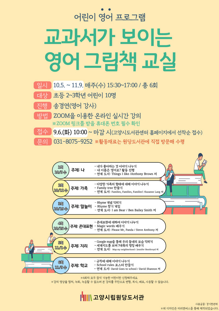 교과서가 보이는 영어 그림책 교실은 Things I like(앤서니 브라운 저) 외 5권의 영어 그림책을 함께 읽으며 실생활에 활용되는 기본 영어 표현을 익히고 다양한 독후 활동을 하는 수업이다. 수업은 10월 5일부터 11월 9일까지 매주 수요일 총 6회에 걸쳐 온라인(ZOOM) 강의로 진행된다.