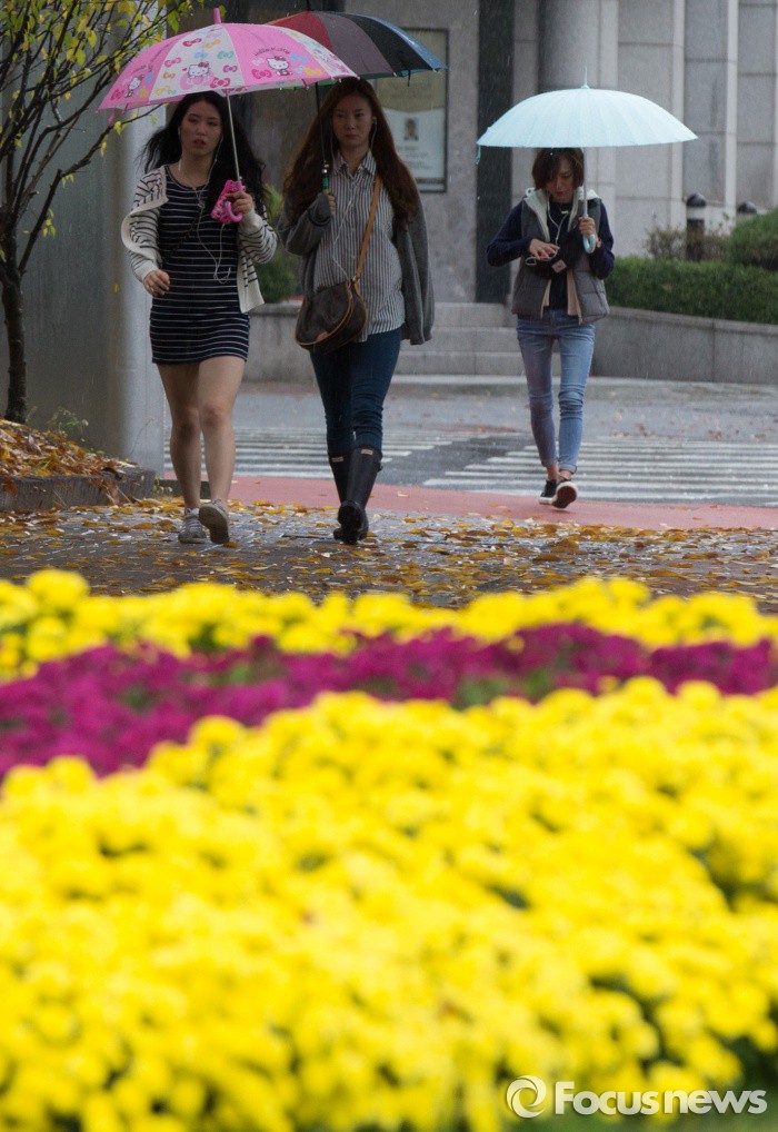 (대전=포커스뉴스) 가을비가 내린 27일 오전 대전 서구 대전시청 앞에서 시민들이 우산을 쓰고 이동하고 있다.