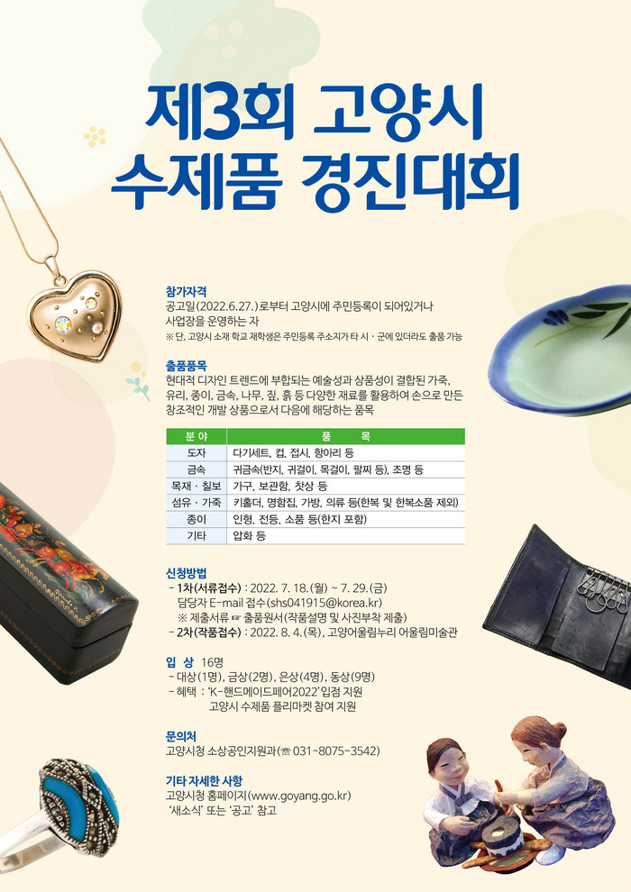 선정된 16개 작품의 입상자에게는 ‘K-핸드메이드페어 2022’ 입점 지원, 고양시 수제품 플리마켓 행사 참여 등의 혜택을 제공한다.