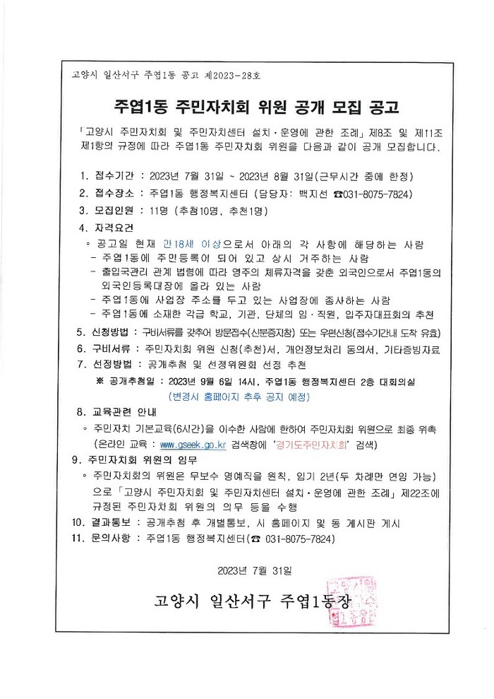 [부자동네타임즈 김인수기자] 고양특례시 주엽1동 행정복지센터가 지역 발전을 함께 이끌어갈 주민자치회 위원을 공개 모집한다.