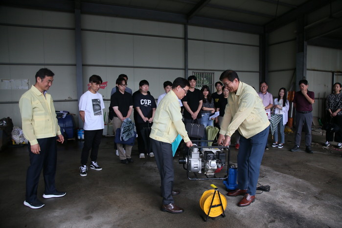 또한 수방자재 창고에서 이루어진 수중펌프, 양수기 등의 현장 장비 교육은 전문가가 참석해 교육을 주도하고 행정복지센터 담당자들의 실습활동을 실시하여 이론과 장비의 작동방법을 충분히 이해할 수 있도록 진행됐다.