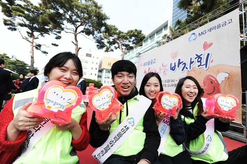 △ 새마을금고중앙회 관계자들이 6일 서울 은평구청 소나무 광장에서 불우이웃돕기 'MG희망나눔 바자회'를 진행하며 기념촬영하고 있다. <사진제공=새마을금고> |