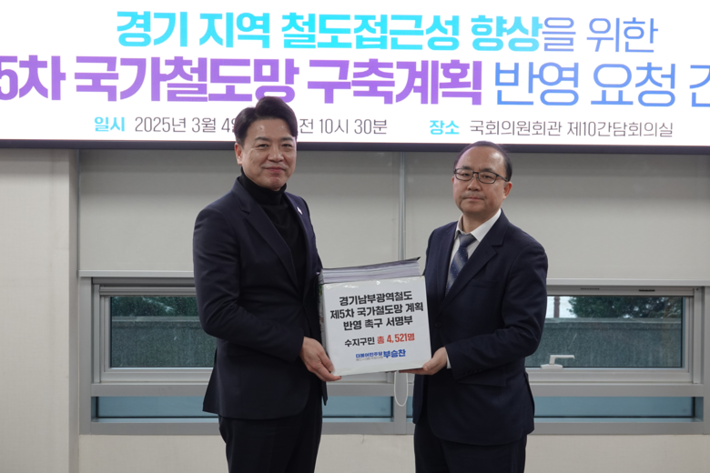부승찬 의원은 “경기남부광역철도는 용인 수지 주민들의 교통난을 획기적으로 개선할 수 있는 사업으로, 2021년 좌초돼 수지 구민의 한까지 서린 사업이다”라며, “정부와 협력하고 수혜지역인 수원·성남·화성 지자체장 및 국회의원과 연대해 경기남부광역철도 구축계획이 제5차 국가철도망에 포함될 수 있도록 최선을 다하겠다”라고 밝혔다.