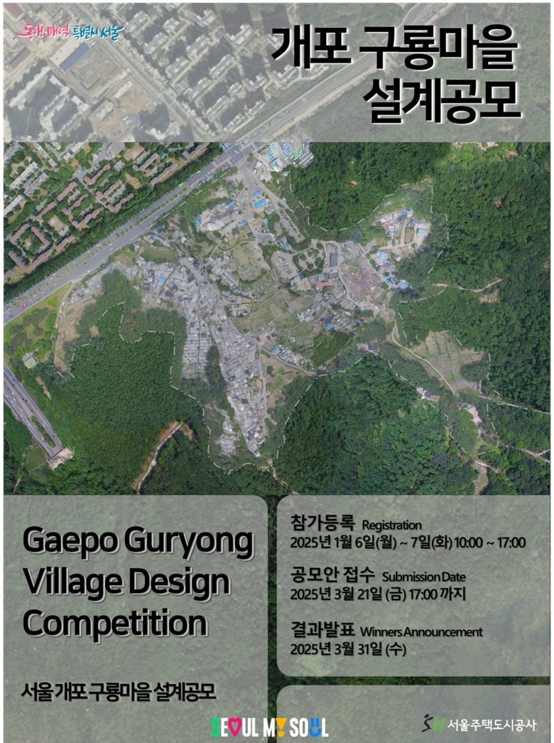 SH공사는 강남구 양재대로 478 일원에 위치한 ‘개포 구룡마을’에 대한 설계 공모를 ‘프로젝트 서울’ 누리집에 공고하고, 기본 계획안 및 건축 설계안을 접수받는다고 31일 밝혔다.