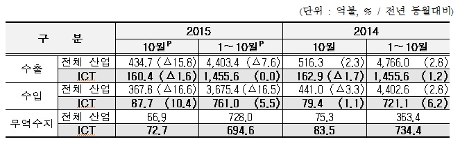 | △ ICT 산업 및 전체 산업 수출입 동향.<표제공=미래부> |