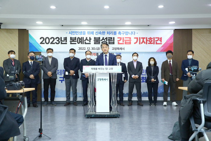 이동환 고양특례시장은 지난 30일 시청 대회의실에서 열린 기자회견에서 담화문을 발표, “시의회에 조속한 예산안 처리를 촉구하는 한편, 준예산체제로 돌입함에 따라 시민피해를 최소화하도록 적극적인 조치를 취하겠다”고 밝혔다.