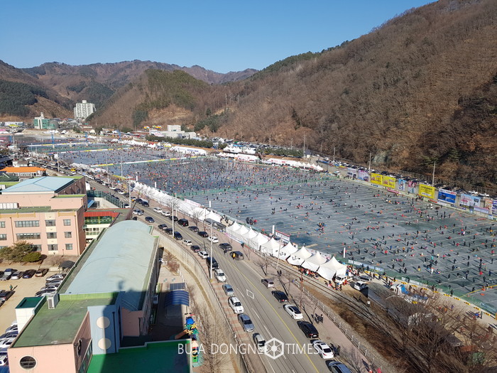 강원 화천 산천어축제 개막 첫날인 14일 매서운 추위속에도 이른 아침부터 수많은 인파가 몰려 얼음낚시를 즐기고 있다.2017.01.14