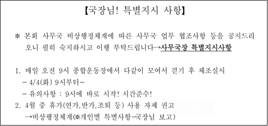[부자동네타임즈 김인수기자] 고양시체육회 직원들의 강제 아침 트랙걷기와 함께 못하는 직원들을 못 마땅히 여기며 모든 지도자들의 수업시간을 10시 반 이후로 조정할 것을 지시하였다고 진술한 내용이다.