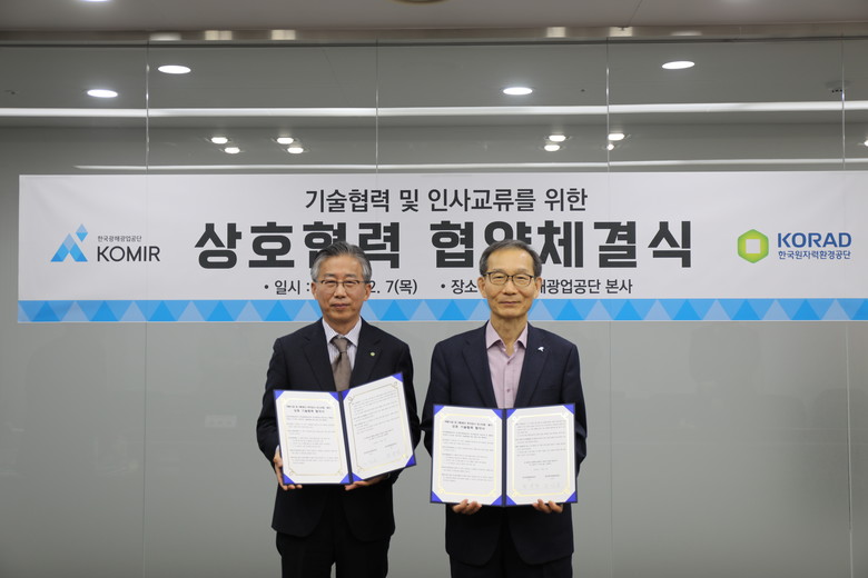 한국광해광업공단(사장 황규연, 이하 KOMIR)은 7일 한국원자력환경공단과 방폐물 처분시설과 폐광산 부지감시 및 평가를 위한 기술협약을 체결했다고 밝혔다.