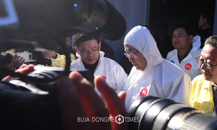 반기문 전 유엔 사무총장이 14일 오후 충북 음성 AI거점 소독소에서 방역관계자로 부터 상황설명을 듣고 있다. 2017.01.14.
