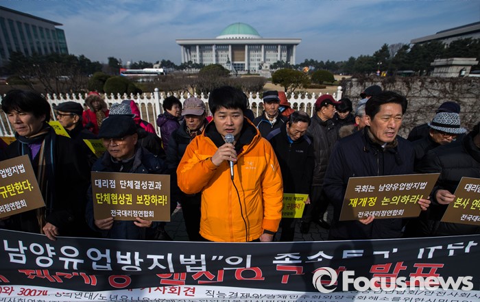 (서울=포커스뉴스) 9일 오전 서울 여의도 국회 앞에서 전국대리점연합회와 시민단체 회원들이 '남양유업방지법' 규탄 및 3대 쟁점 재개정을 촉구하는 기자회견을 하고 있다.