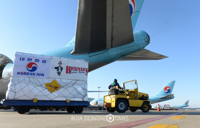 [부자동네타임즈 이채봉 기자]영하 8도를 웃도는 올 겨울 최강한파가 맹위를 떨친 14일 오전. 대한항공 보잉 747 화물기가 미국 로스앤젤레스(LA)에서 시판용 수입계란 100t을 싣고 인천공항 화물터미널에 도착했다.