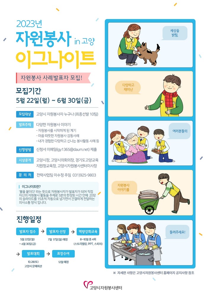 [부자동네타임즈 김인수기자] 고양시자원봉사센터(이하 센터)에서는 22일부터 다음 달 30일까지 2023 자원봉사 이그나이트 in 고양에 참가할 발표자를 모집한다.