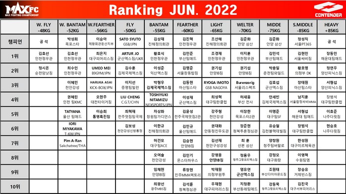 [부자동네타임즈 김인수기자] 국내 최대 입식격투기 단체 MAX FC(대표 이용복)가 2022년 6월 랭킹을 발표했다.