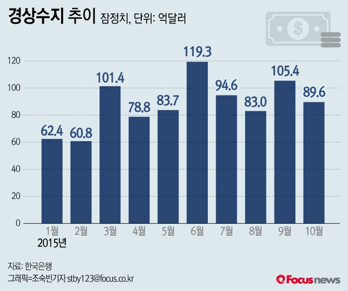 2일 한국은행이 발표한 국제수지(잠정치)에 따르면 10월 경상수지 흑자규모는 89억6000만달러로 집계돼 사상 최장기간 동안 흑자를 기록했다.
