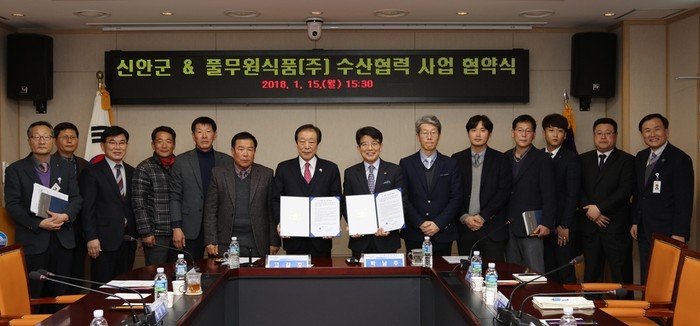 풀무원식품(대표 박남주)은 15일 전라남도 신안군청에서 고길호 신안군수, 박남주 풀무원식품 대표 등 관계자들이 참석한 가운데 수산물의 안정적 공급 및 어촌 소득 증대를 위한 MOU를 체결했다고 16일 밝혔다.