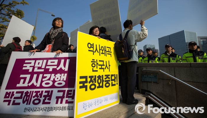 (서울=포커스뉴스) 역사교과서 국정화가 확정고시 된 3일 오전 서울 종로구 정부서울청사 앞에서 한국사 교과서 국정화 저지 네트워크 회원들이 정부의 교과서 국정화 추진을 규탄하는 손피켓을 들고 있다.